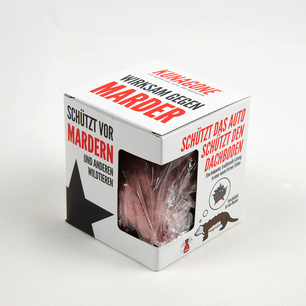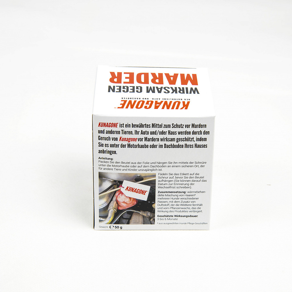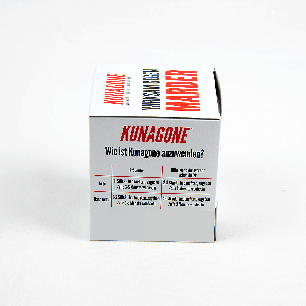 Kunagone ist ein neues Produkt aus Naturstoffen, Hergestellt in der EU. Kunagone schreckt den Marder und verhindert so einen Marderbiss auf das elektrische System Ihres Autos. Dieses Produkt setzt einen Duft frei welcher für den Marder dem Duft eines natürlichen Feinds gleicht. Dieser Duft schreckt nicht nur Marder, sondern auch noch andere Wildtiere. Die Anwendung eignet sich an allen Stellen und Orten wo die Anwesenheit von Wildtieren unerwünscht ist.