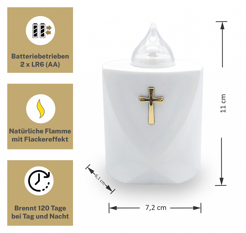 ELEGANTES DESIGN:Diese Grabkerze besticht durch ein elegantes Design. Ihr hochwertiges Erscheinungsbild, verziert mit dem Heiligen Kreuz, macht sie zu einer einzigartigen Hommage. Sie verleiht Grabstätten eine besondere Note von Anmut und Ruhe und schafft eine bedeutungsvolle und friedliche Atmosphäre. BIS ZU 120 TAGE LEUCHTDAUER:Angetrieben von 2x R6 (AA) Batterien bietet diese Kerze bis zu 120 Tage Licht ohne Unterbrechung. Der praktische EIN/AUS-Schalter ermöglicht, die Batterien bei Bedarf zu schonen, so dass diese noch länger halten. Dies reduziert nicht nur den Abfall im Vergleich zu herkömmlichen Grabkerzen, sondern spart auch langfristig Geld. REALISTISCH FLACKERNDE FLAMME: Diese Kerze erzeugt eine sanft flackernde gelbe Flamme, die einer echten brennenden Kerze täuschend ähnlich sieht. Dieses sanfte Leuchten bringt Wärme und Trost auf die Grabstätte und schafft eine friedliche Atmosphäre für Momente der Besinnung. Dank der LED-Technologie ist die Flamme völlig feuer-sicher und bietet die Schönheit einer traditionellen Kerze ohne die damit verbundenen Risiken. PRAKTISCH UND KOSTENGÜNSTIG:Dank des energieeffizienten Designs können die Standard-AA-Batterien einfach und kostengünstig ersetzt werden. SCHAFFEN SIE EINE BLEIBENDE ERINNERUNG:Sie haben die Möglichkeit aus 4 Farben zu wählen für eine wahrhaft herzliche Hommage, welche das Andenken an Ihre Liebsten ehrt und die Erinnerungen lebendig hält.
