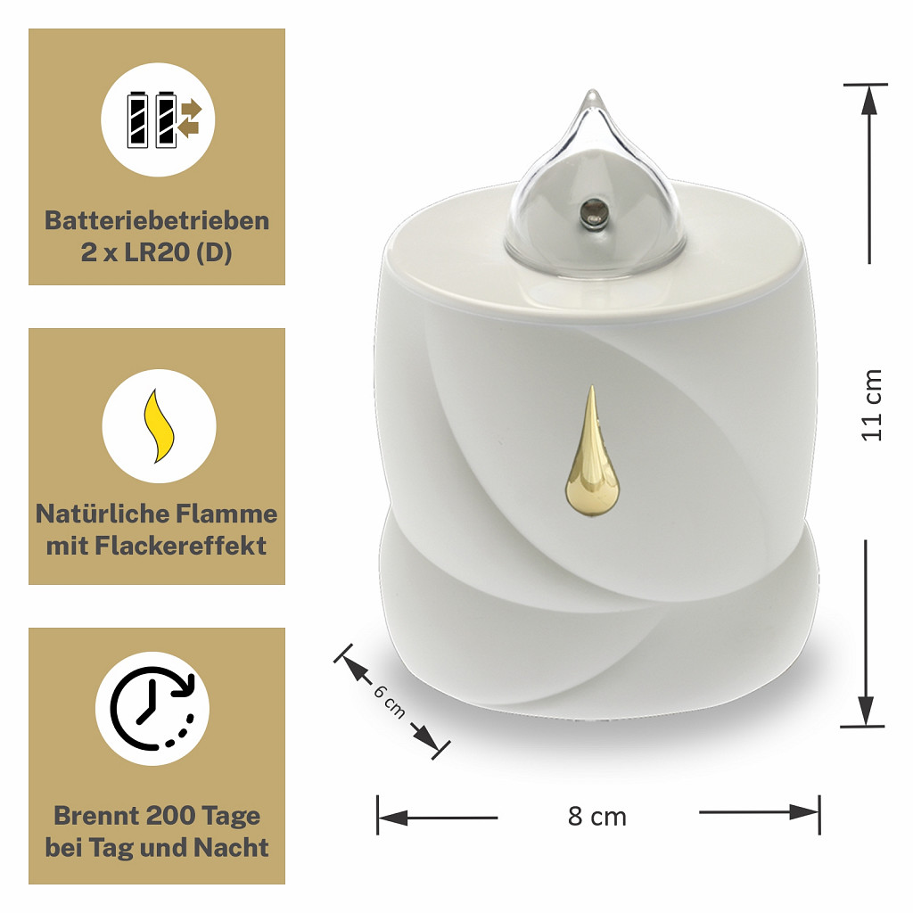 BIS ZU 200 TAGE LEUCHTDAUER:Angetrieben von 2x LR20 (Mono D) Batterien bietet diese Kerze bis zu 200 Tage Licht ohne Unterbrechung. Dies reduziert nicht nur den Abfall im Vergleich zu herkömmlichen Grabkerzen, sondern spart auch langfristig Geld.