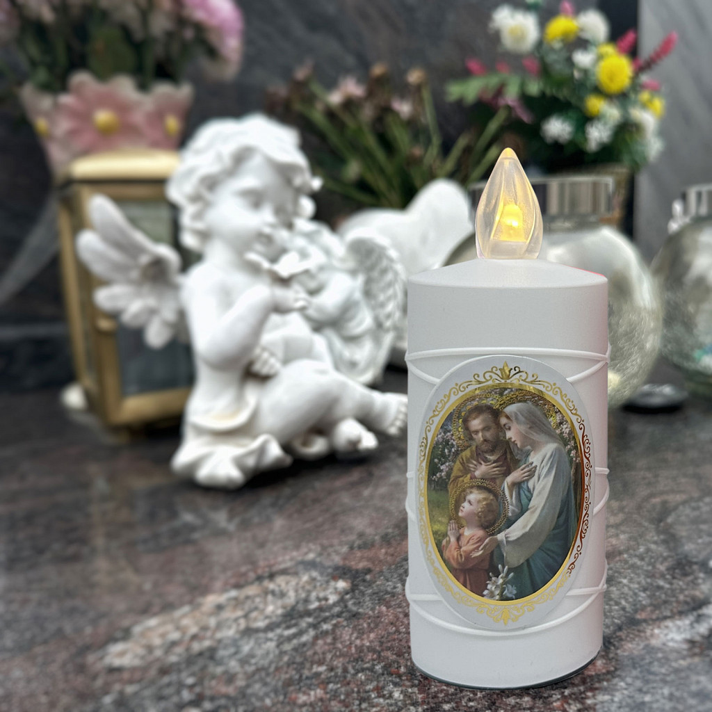 ELEGANTES DESIGN:Diese Grabkerze besticht durch ein elegantes Design. Ihr hochwertiges Erscheinungsbild, verziert mit Bildern heiliger Figuren wie der Heiligen Familie, Heiligem Engel, Jesus Christus oder der Heiligen Maria, macht sie zu einer einzigartigen und personalisierten Hommage. Sie verleiht Grabstätten eine besondere Note von Anmut und Ruhe und schafft eine bedeutungsvolle und friedliche Atmosphäre. BIS ZU 120 TAGE LEUCHTDAUER:Angetrieben von 2x R6 (AA) Batterien bietet diese Kerze bis zu 120 Tage Licht ohne Unterbrechung. Der praktische EIN/AUS-Schalter ermöglicht, die Batterien bei Bedarf zu schonen, so dass diese noch länger halten. Dies reduziert nicht nur den Abfall im Vergleich zu herkömmlichen Grabkerzen, sondern spart auch langfristig Geld. REALISTISCH FLACKERNDE FLAMME: Diese Kerze erzeugt eine sanft flackernde gelbe Flamme, die einer echten brennenden Kerze täuschend ähnlich sieht. Dieses sanfte Leuchten bringt Wärme und Trost auf die Grabstätte und schafft eine friedliche Atmosphäre für Momente der Besinnung. Dank der LED-Technologie ist die Flamme völlig feuer-sicher und bietet die Schönheit einer traditionellen Kerze ohne die damit verbundenen Risiken. PRAKTISCH UND KOSTENGÜNSTIG:Dank des energieeffizienten Designs können die Standard-AA-Batterien einfach und kostengünstig ersetzt werden. SCHAFFEN SIE EINE PERSONALISIERTE UND BLEIBENDE ERINNERUNG:Mit dem Kauf dieser Kerze haben Sie die Möglichkeit, diese noch bedeutsamer zu gestalten. Wählen Sie aus einer Auswahl beliebter Heiliger. Jedes Bild ermöglicht Ihnen, diese Kerze auf Ihre Weise zu personalisieren, die die tiefe Liebe und den Respekt widerspiegelt, welchen Sie für den Verstorbenen empfinden. Diese durchdachte Personalisierung verwandelt diese Kerze in eine wahrhaft herzliche Hommage, welche das Andenken an Ihre Liebsten ehrt und die Erinnerungen lebendig hält.