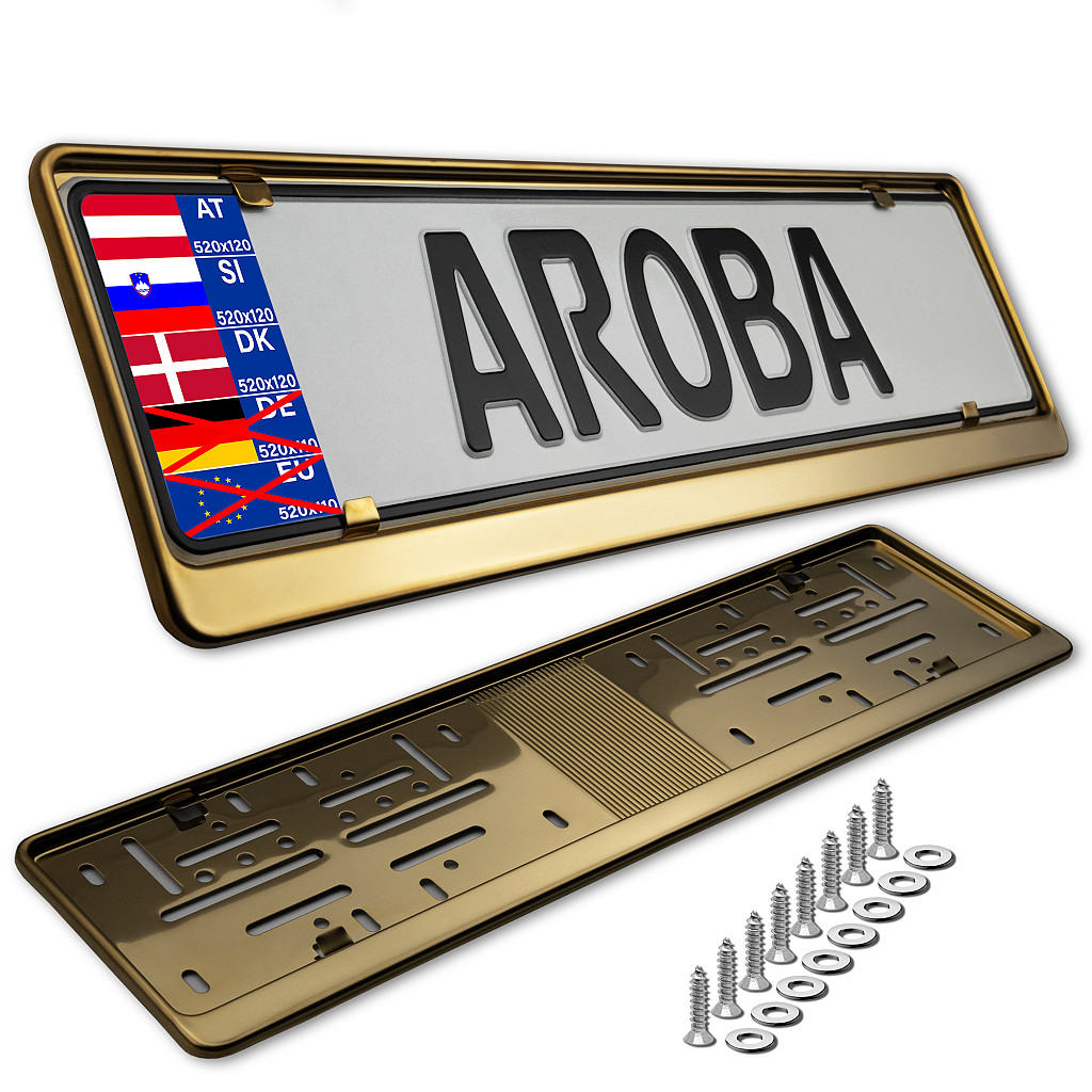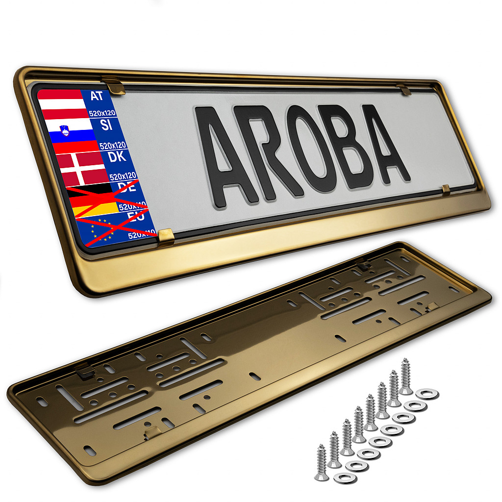2x Auto License Plate Holder STAINLESS STEEL GOLD for Austria and Slovenia license plates size 520mm x 120mm (not for Germany and EU license plates!)
