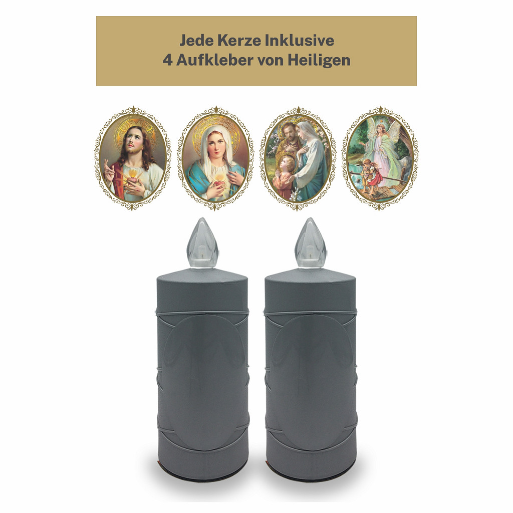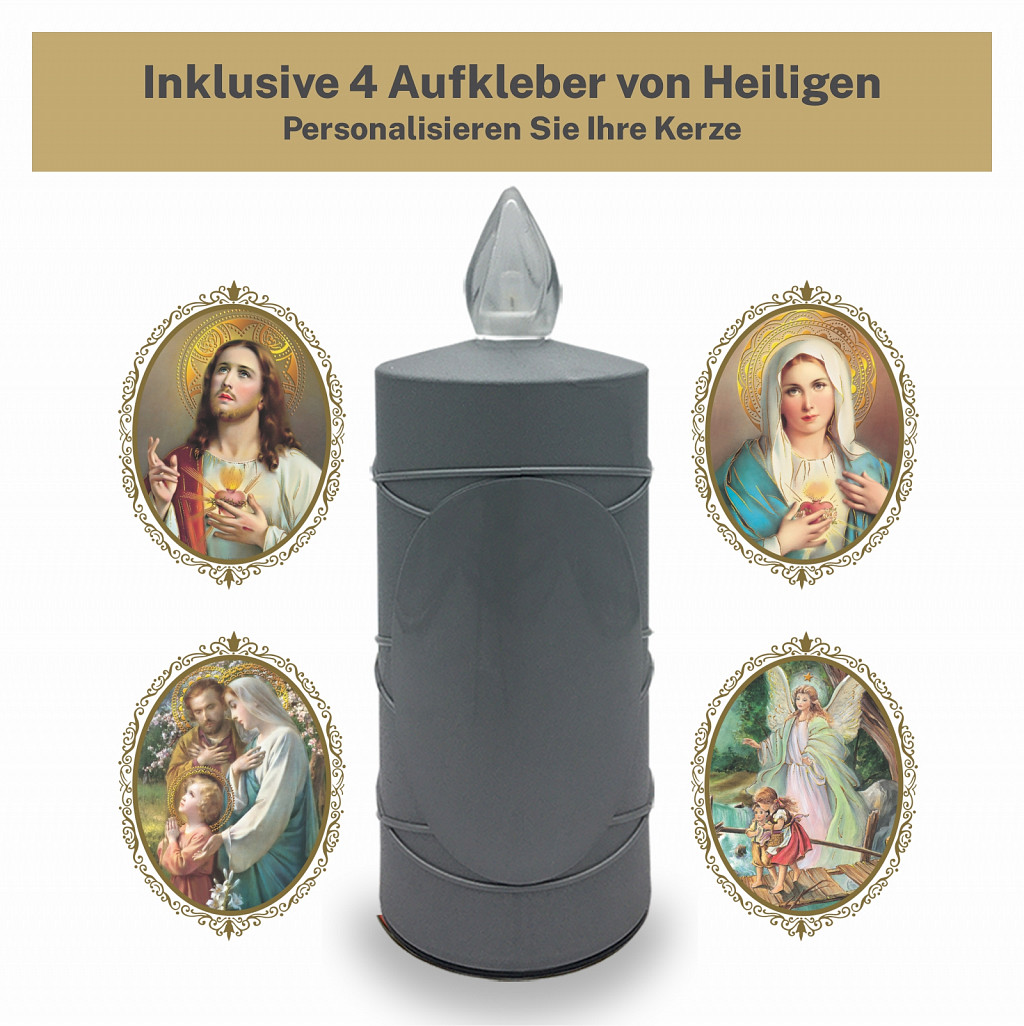 AROBA 2x LED grave candle memorial light – flickering effect like a real candle – long burning time up to 120 days – reusable cemetery candle remembrance candle eternal candle – SILVER – MIXED SAINTS Sticker Set