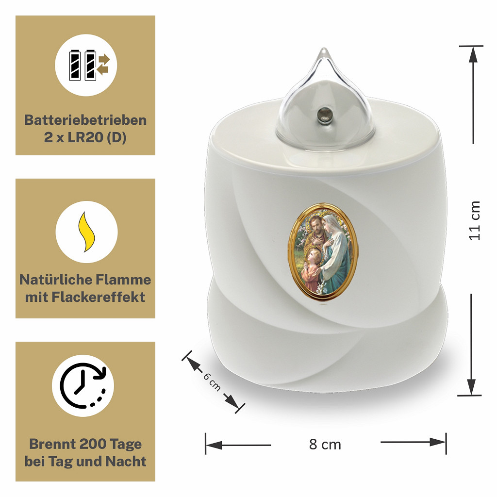 ELEGANT DESIGN:This grave candle impresses with its elegant design. Its high-quality appearance, decorated with images of holy figures such as the Holy Family, Holy Angel, Jesus Christ, the Holy Mary, or Saint Anthony, makes it a unique and personalized tribute. It adds a special touch of grace and serenity to gravesites, creating a meaningful and peaceful atmosphere. UP TO 200 DAYS OF LIGHT DURATION:Powered by 2x LR20 (Mono D) batteries, this candle provides up to 200 days of uninterrupted light. This not only reduces waste compared to traditional grave candles, but also saves money in the long run. REALISTIC FLICKERING FLAME: This candle creates a gently flickering yellow flame that looks deceptively similar to a real burning candle. This soft glow brings warmth and comfort to the gravesite and creates a peaceful atmosphere for moments of reflection. Thanks to LED technology, the flame is completely fire-safe and offers the beauty of a traditional candle without the associated risks. PRACTICAL AND COST-EFFECTIVE:Thanks to the energy-efficient design, the standard Mono D (LR20) batteries can be easily and inexpensively replaced. CREATE A PERSONALIZED AND LASTING MEMORY:With the purchase of this candle, you have the opportunity to make it even more meaningful. Choose from a selection of popular saints. Each image allows you to personalize this candle in your own way, reflecting the deep love and respect you feel for the deceased. This thoughtful personalization transforms this candle into a truly heartfelt tribute that honors the memory of your loved ones and keeps their remembrance alive.