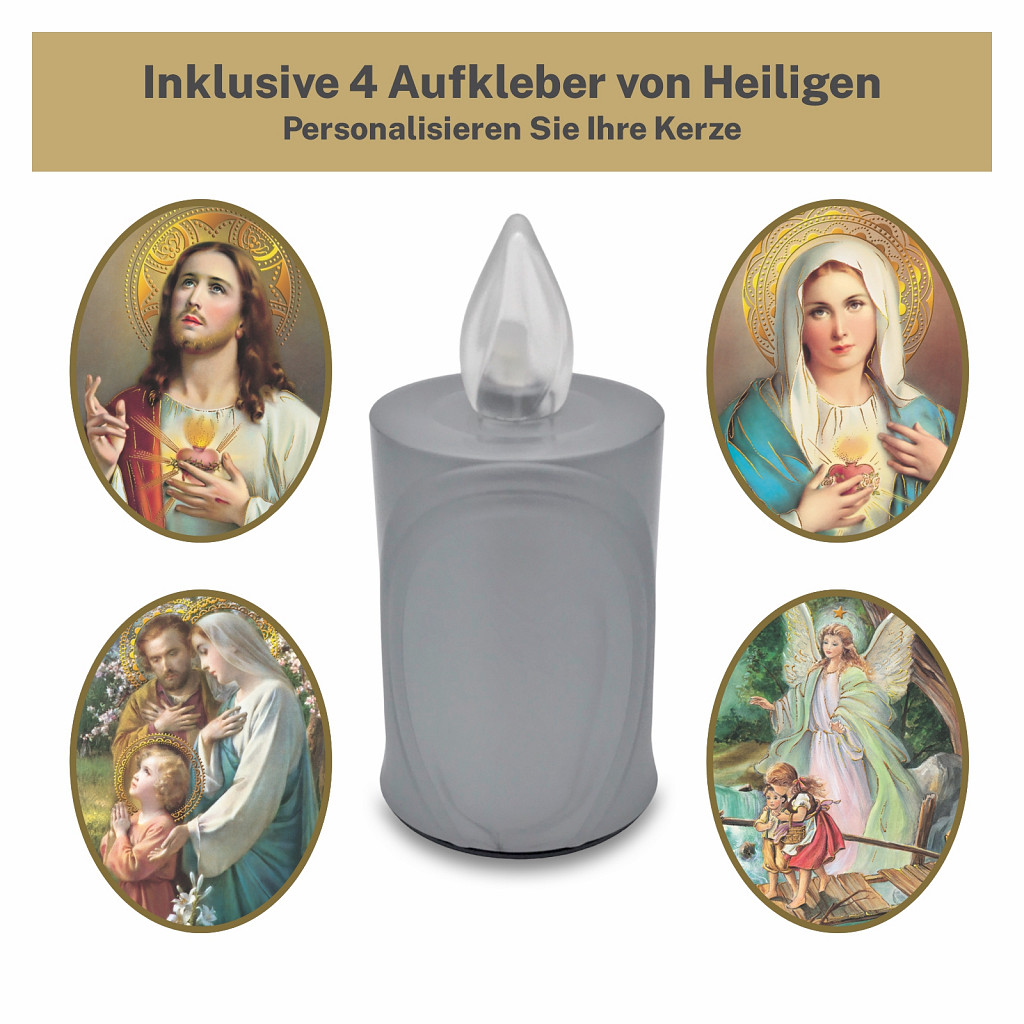 • / AROBA 4x LED grave candle memorial light – flickering effect like a real candle – long burning time up to 120 days – reusable cemetery candle remembrance candle eternal candle – SILVER – MIXED SAINTS Sticker Set