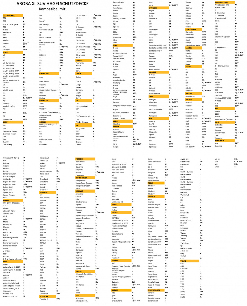 Available in sizes M, L, XL, XXL, and XL SUV – suitable for all vehicle types. Choose your appropriate size from the compatibility chart or by comparing with a vehicle of similar dimensions.