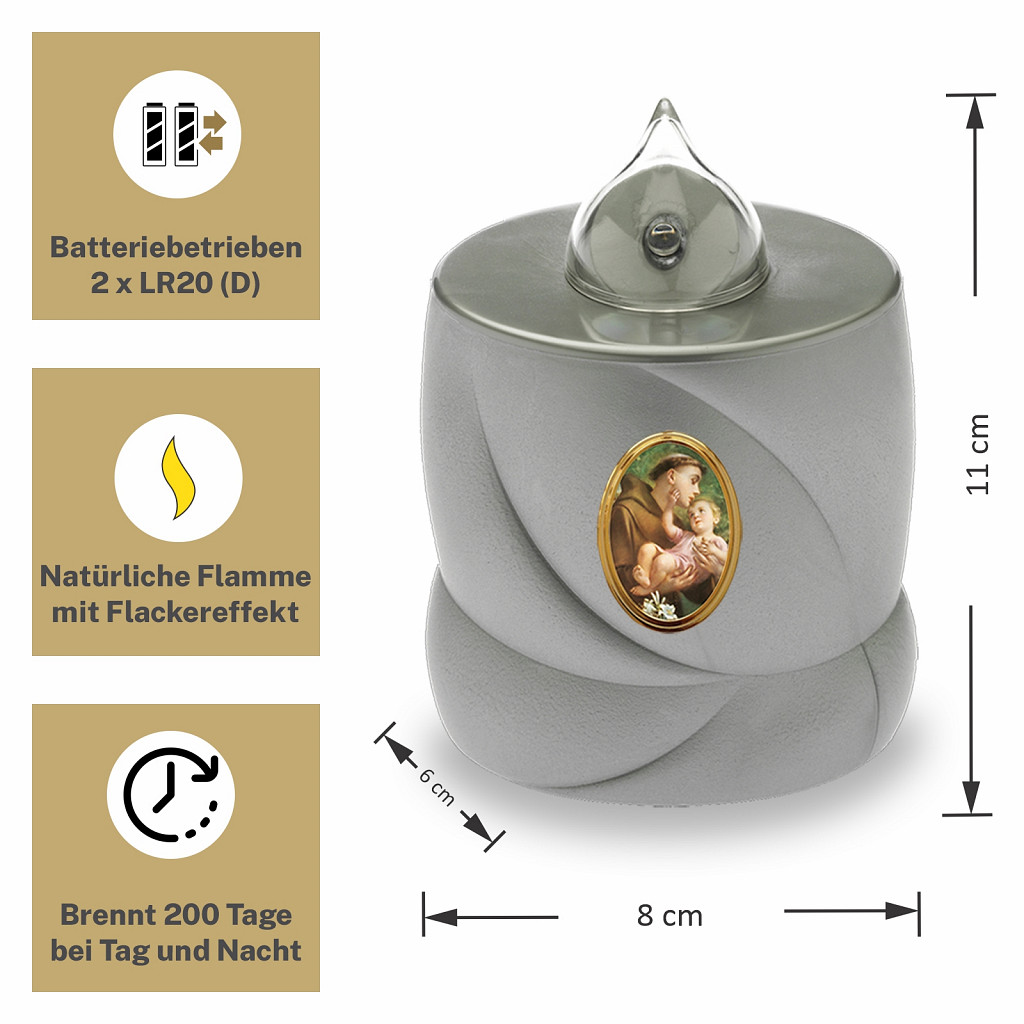 ELEGANT DESIGN:This grave candle impresses with its elegant design. Its high-quality appearance, decorated with images of holy figures such as the Holy Family, Holy Angel, Jesus Christ, the Holy Mary, or Saint Anthony, makes it a unique and personalized tribute. It adds a special touch of grace and serenity to gravesites, creating a meaningful and peaceful atmosphere.