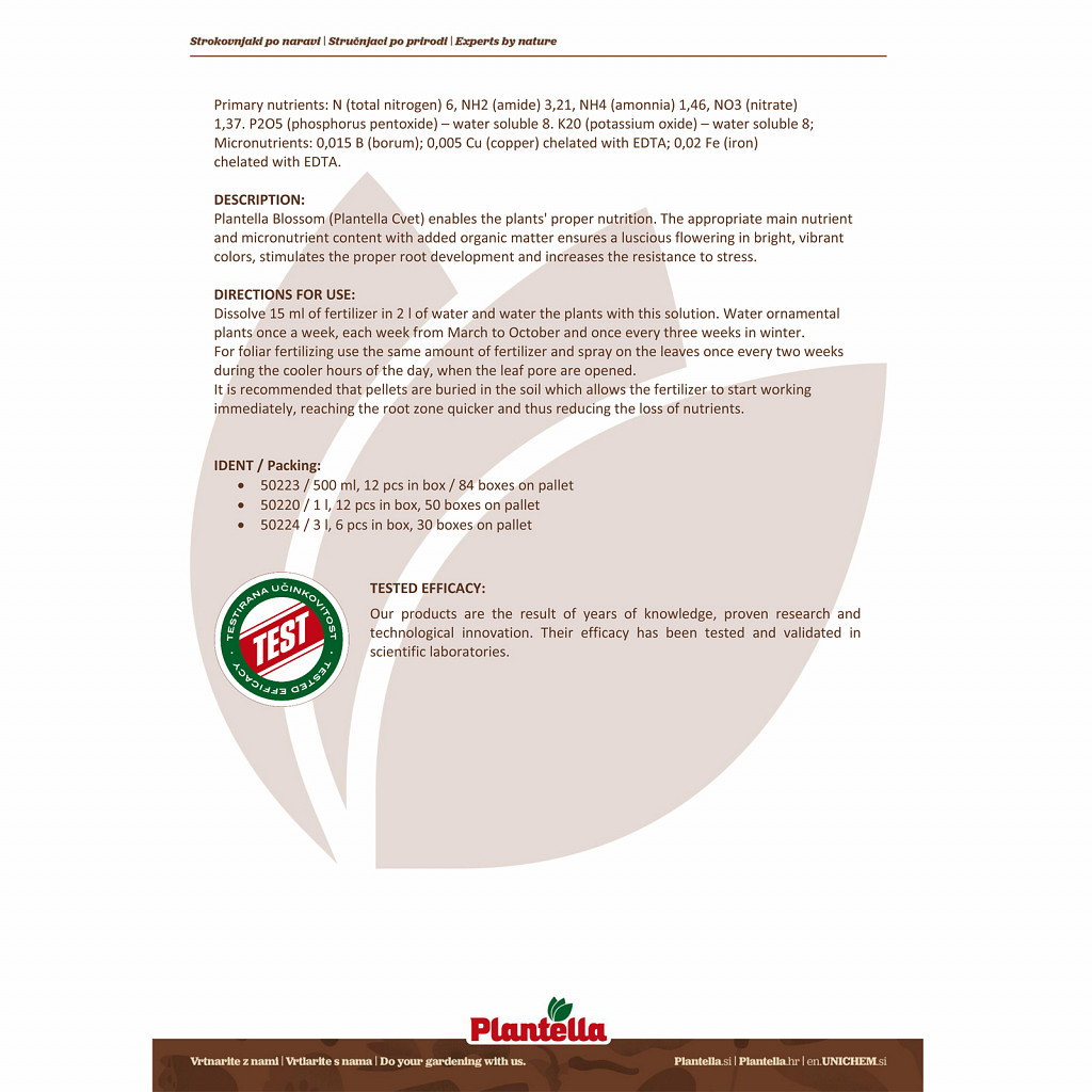Plantella Blume is a powerful liquid fertilizer for all flowering indoor, balcony, and garden plants. Its unique formula of seaweed extracts, essential vitamins, and special bloom activators ensures intense and long-lasting flowering.