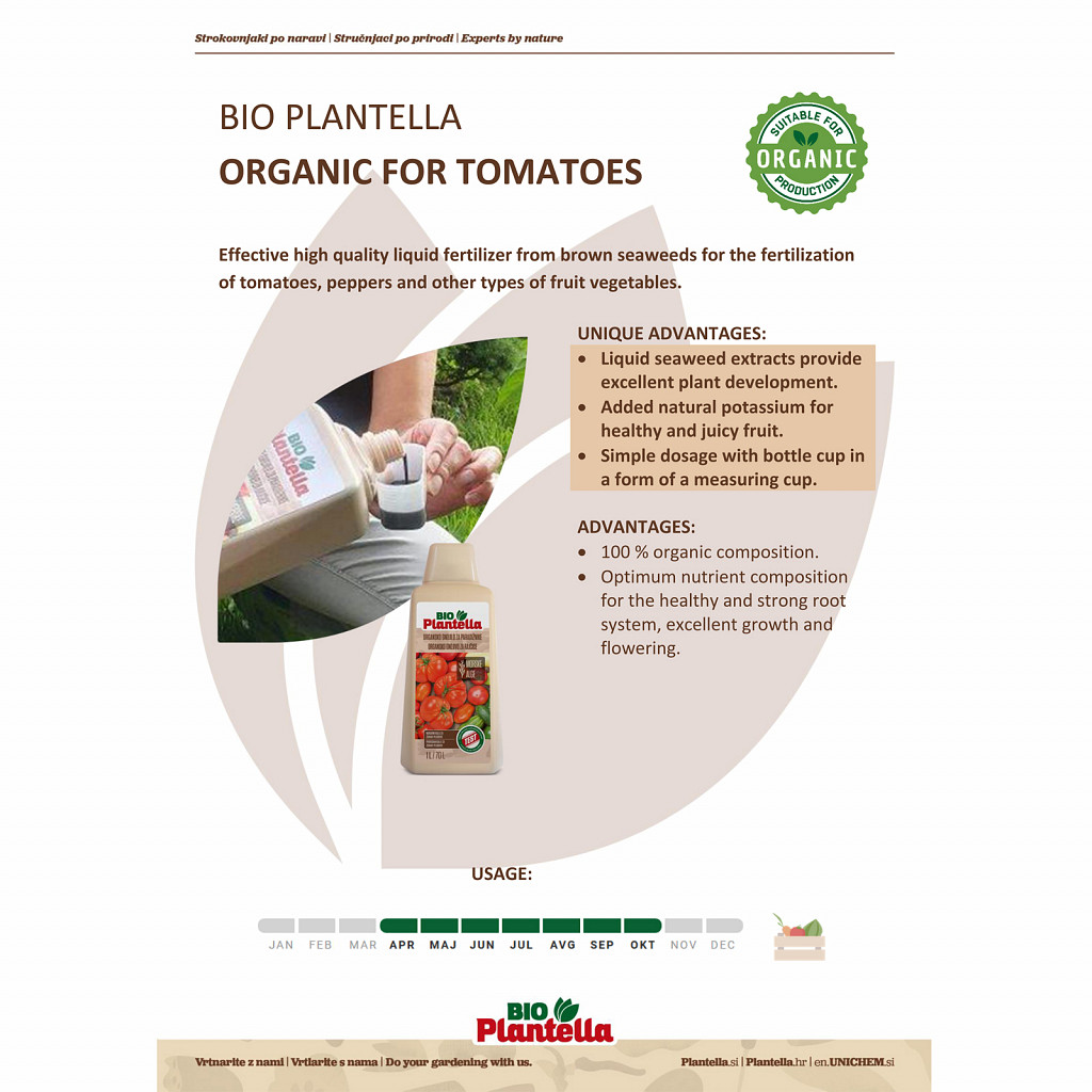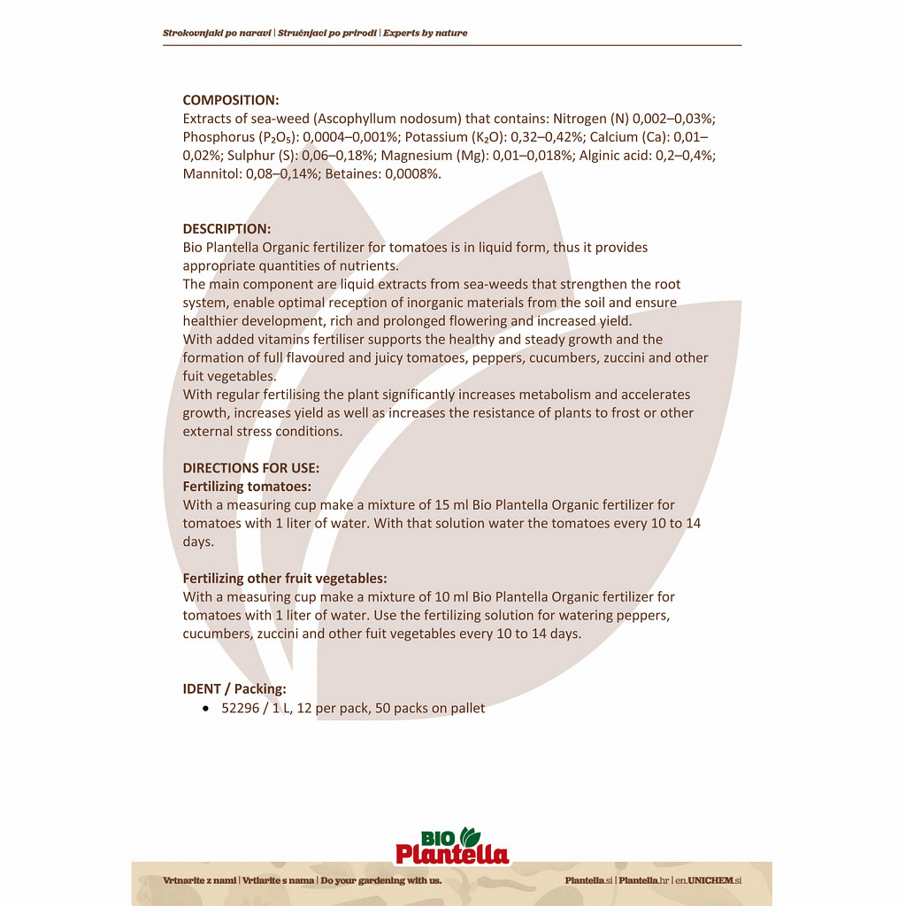 BIO Plantella is a high-quality liquid fertilizer made from seaweed extract with added potassium, vitamins, and minerals – developed for the optimal care of tomatoes, peppers, zucchini, cucumbers, and other fruit vegetables. The organic composition supports plants naturally, without any chemical additives.