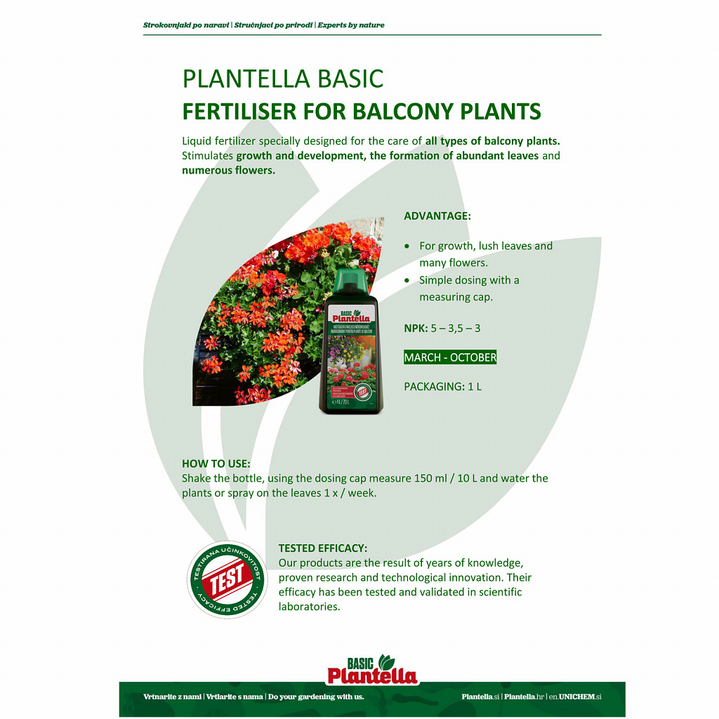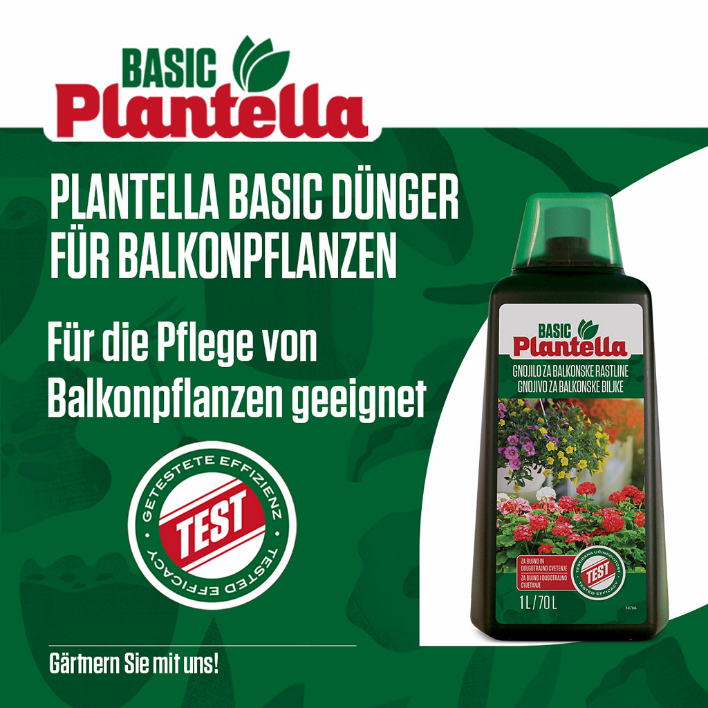 Plantella Basic Liquid Fertilizer for balcony plants is the ideal solution for colorful blooms on your balcony or terrace. The high-quality formula provides your plants with all necessary nutrients for strong growth, lush green leaves, and long-lasting flowering.