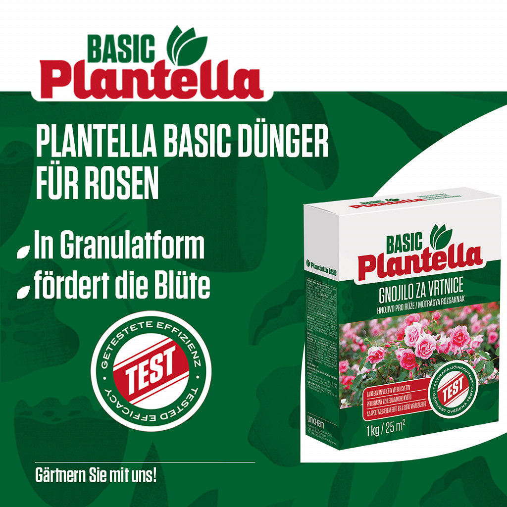 Plantella Basic Rose Fertilizer is specially designed for the care of all types of roses – from classic garden roses to magnificent climbing roses. The high-quality granular formula provides all essential nutrients for vigorous growth, healthy leaves, and intense flowering.
