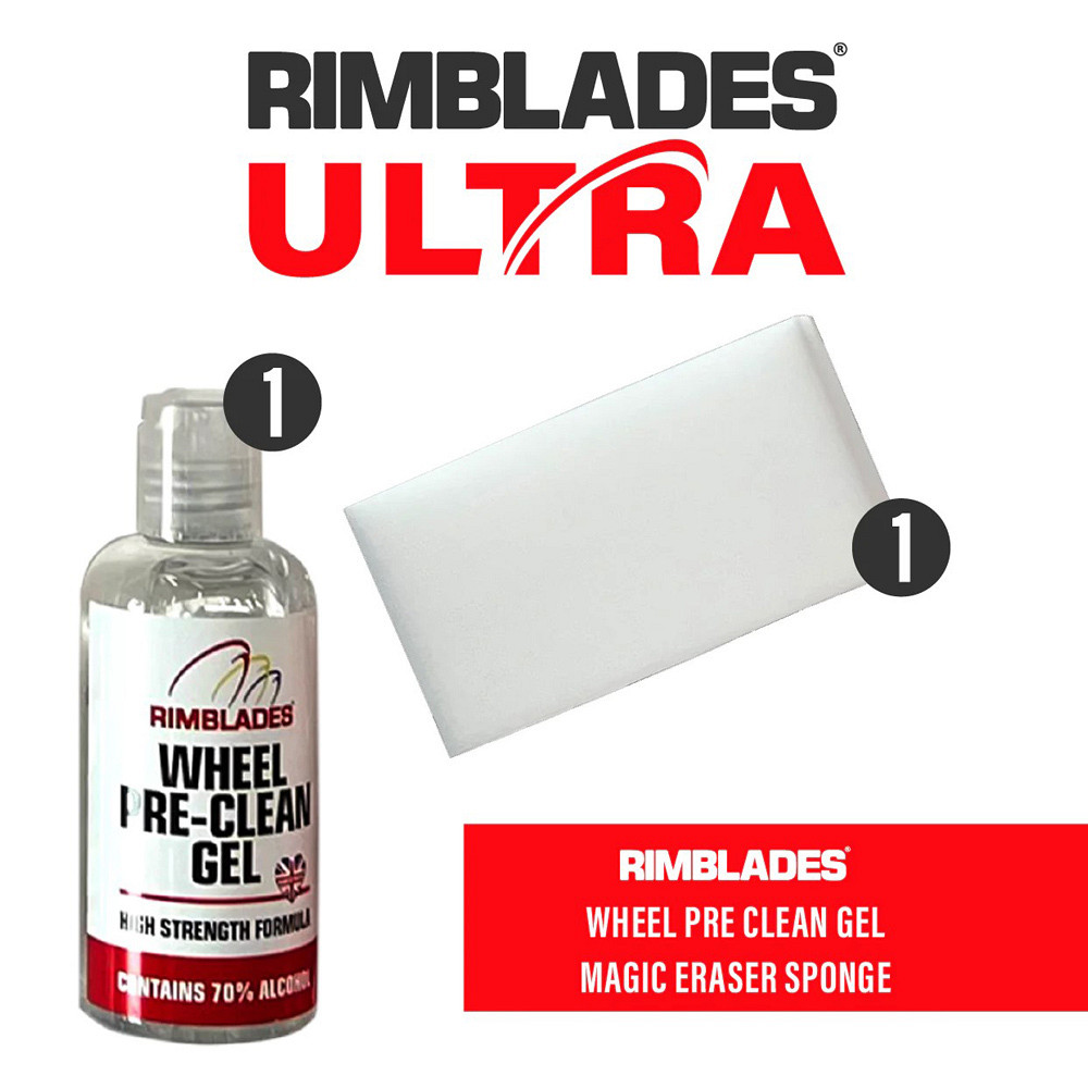 The set includes a bottle of Rimblades Wheel Pre Clean Gel (70% alcohol) and 1 special sponge.