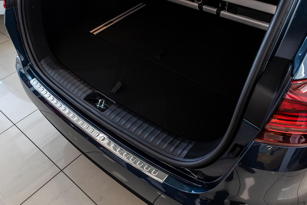The Aroba stainless steel rear bumper protection protects the entire loading area from scratches and damage. This loading edge protection is precisely shaped to fit perfectly over the shape of the bumper.