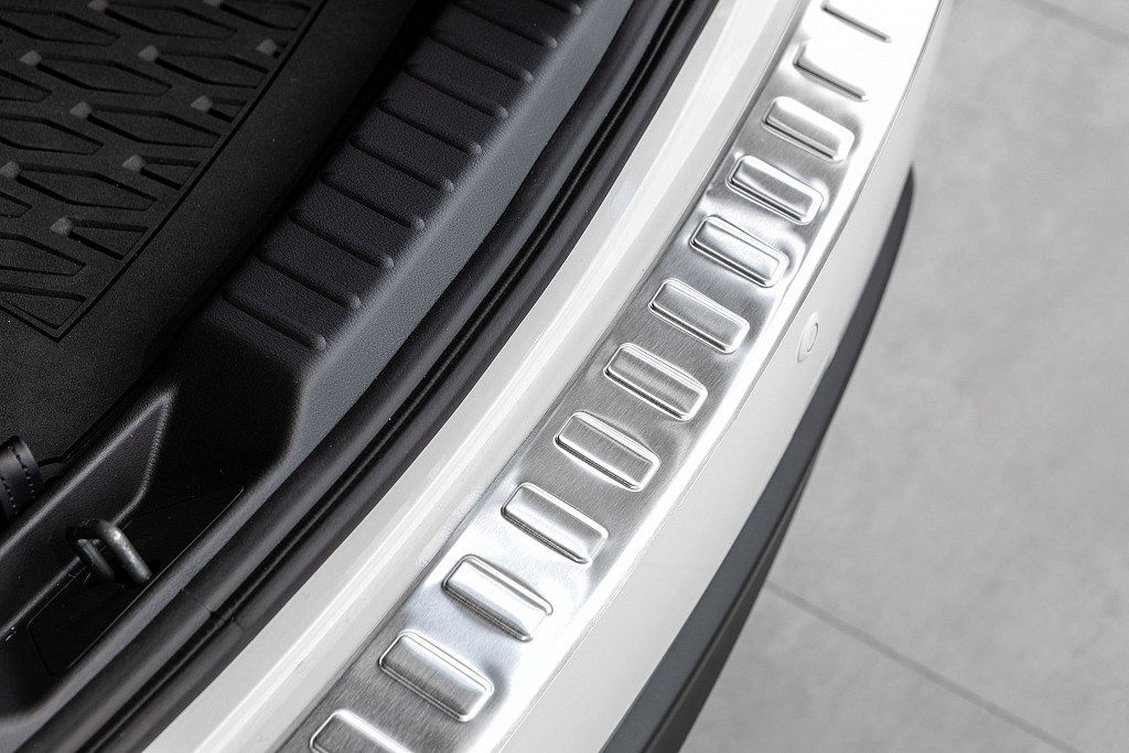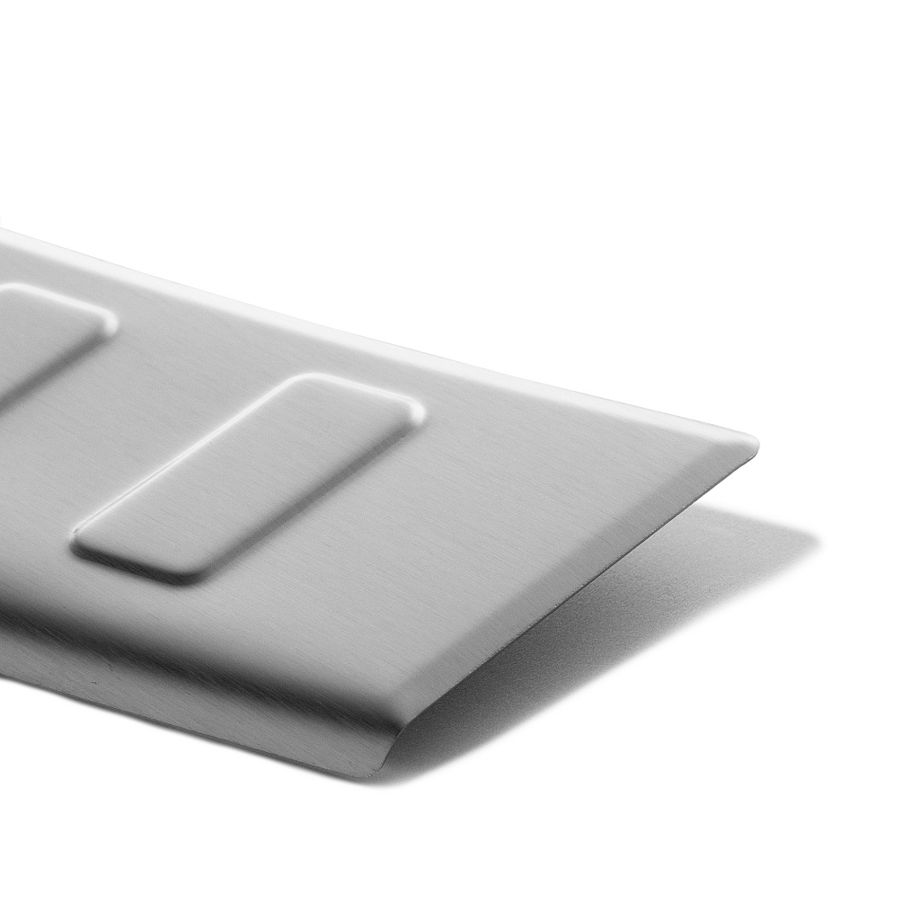 The Aroba stainless steel rear bumper protection protects the entire loading area from scratches and damage. This loading edge protection is precisely shaped to fit perfectly over the shape of the bumper.