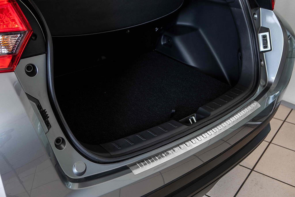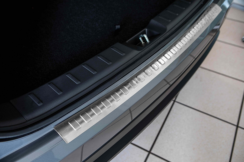 The Aroba stainless steel rear bumper protection protects the entire loading area from scratches and damage. This loading edge protection is precisely shaped to fit perfectly over the shape of the bumper.