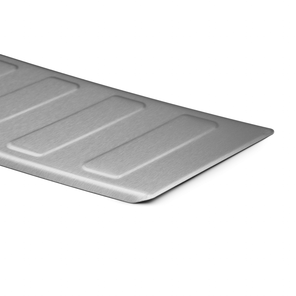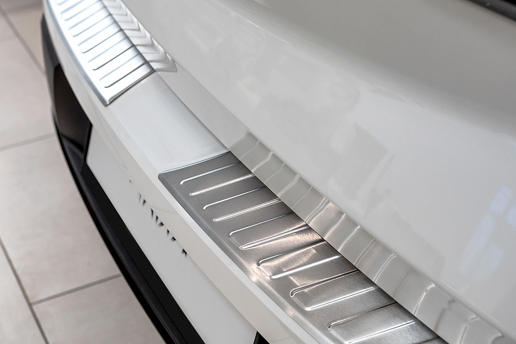The Aroba stainless steel rear bumper protection protects the entire loading area from scratches and damage. This loading edge protection is precisely shaped to fit perfectly over the shape of the bumper.