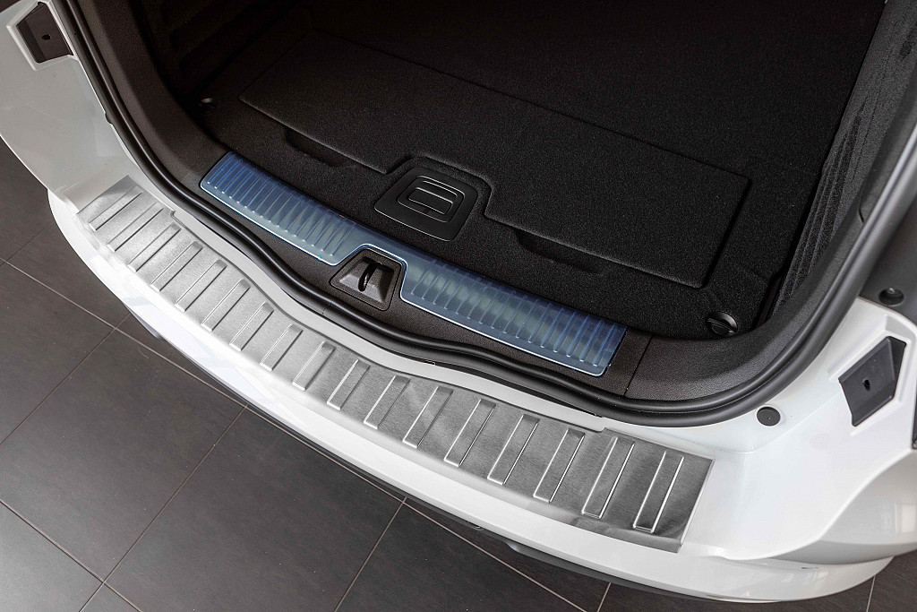 The Aroba stainless steel rear bumper protection protects the entire loading area from scratches and damage. This loading edge protection is precisely shaped to fit perfectly over the shape of the bumper.