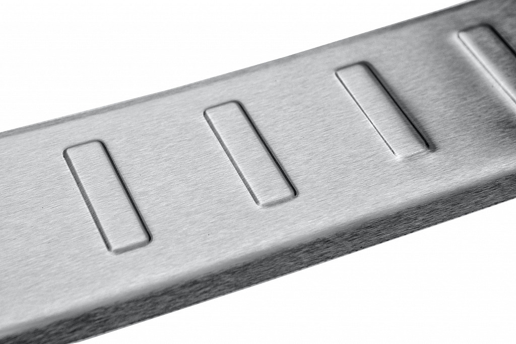 The Aroba stainless steel rear bumper protection protects the entire loading area from scratches and damage. This loading edge protection is precisely shaped to fit perfectly over the shape of the bumper.