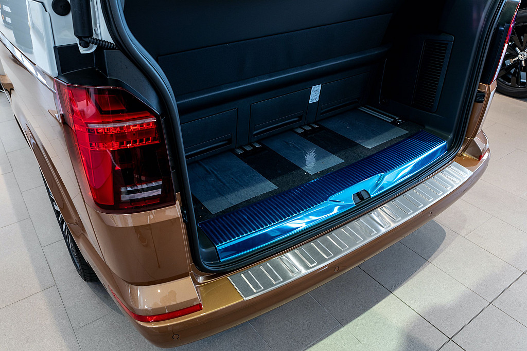 The Aroba stainless steel rear bumper protection protects the entire loading area from scratches and damage. This loading edge protection is precisely shaped to fit perfectly over the shape of the bumper.