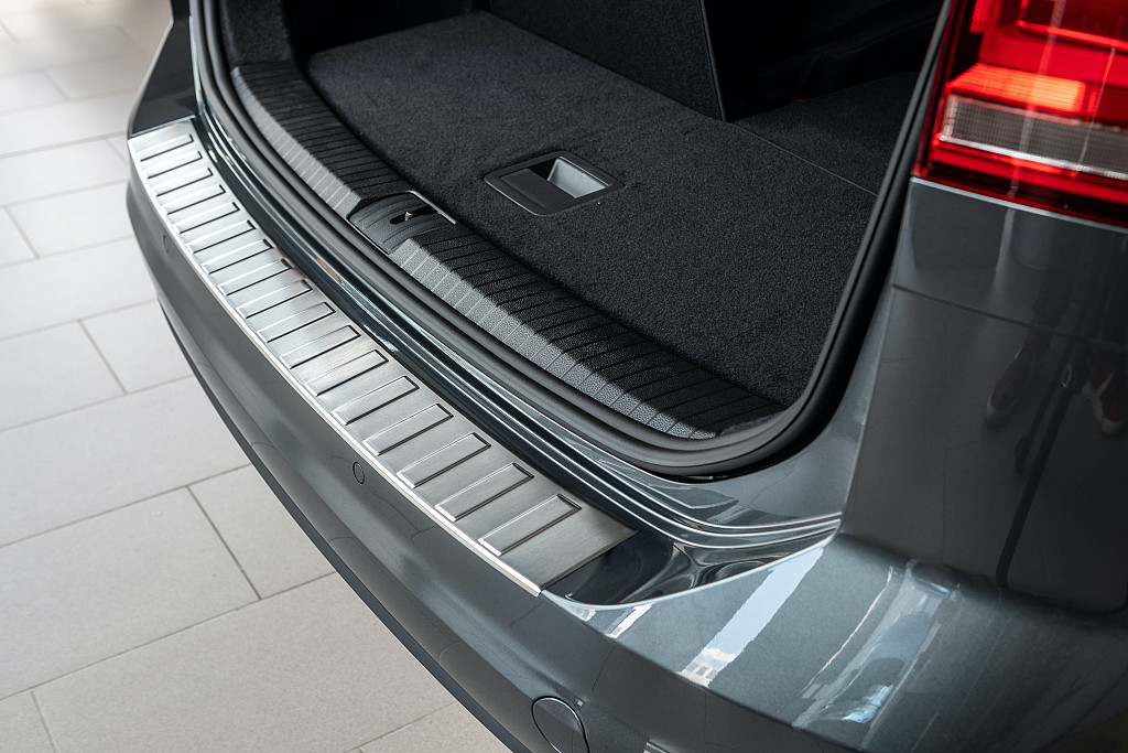 The Aroba stainless steel rear bumper protection protects the entire loading area from scratches and damage. This loading edge protection is precisely shaped to fit perfectly over the shape of the bumper.