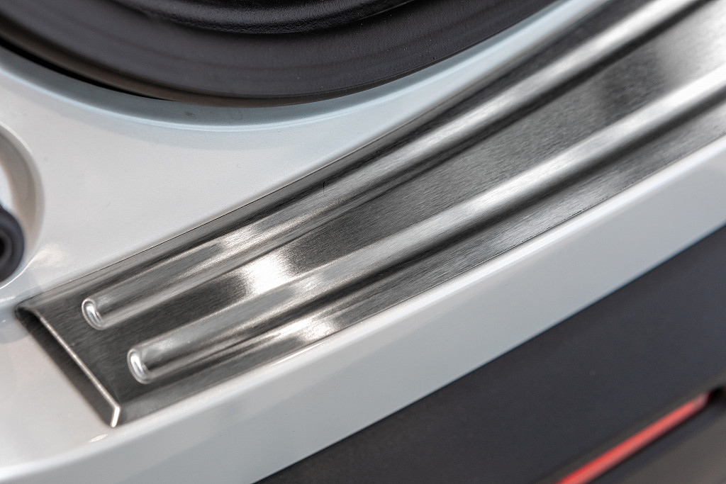 The Aroba stainless steel rear bumper protection protects the entire loading area from scratches and damage. This loading edge protection is precisely shaped to fit perfectly over the shape of the bumper.