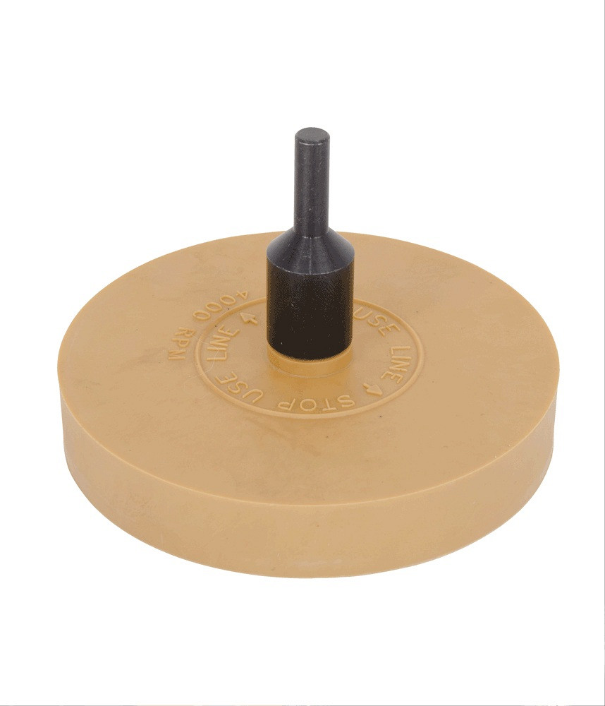 Aufsatz auf den Radierer aufschrauben, Radierer in einen Akkuschrauber oder Bohrmaschine einsetzen. Die maximale empfohlene Drehzahl nicht überschreiten! Vorsichtig und sanft (ohne starkem Druck) die Kleberreste von der Oberfläche abradieren. Anschließend keinere Kleberreste mit Reinigungsalkohol entfernen.
