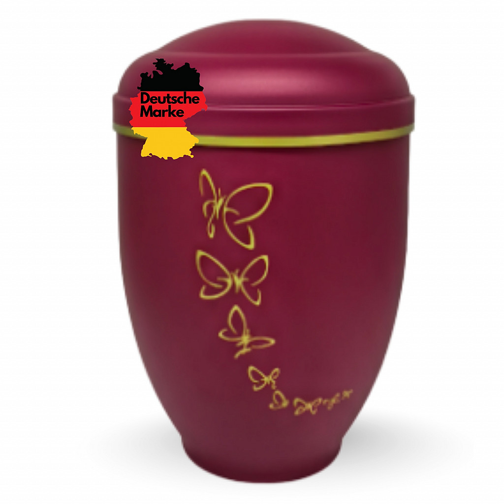 Diese stilvolle Urne verbindet gefühlvolle Symbolik mit eleganter Formgebung. Die bordeauxrote, matte Oberfläche bildet die perfekte Kulisse für die zart gravierten Schmetterlinge in Gold – ein Sinnbild für Übergang, Freiheit und seelische Reise.