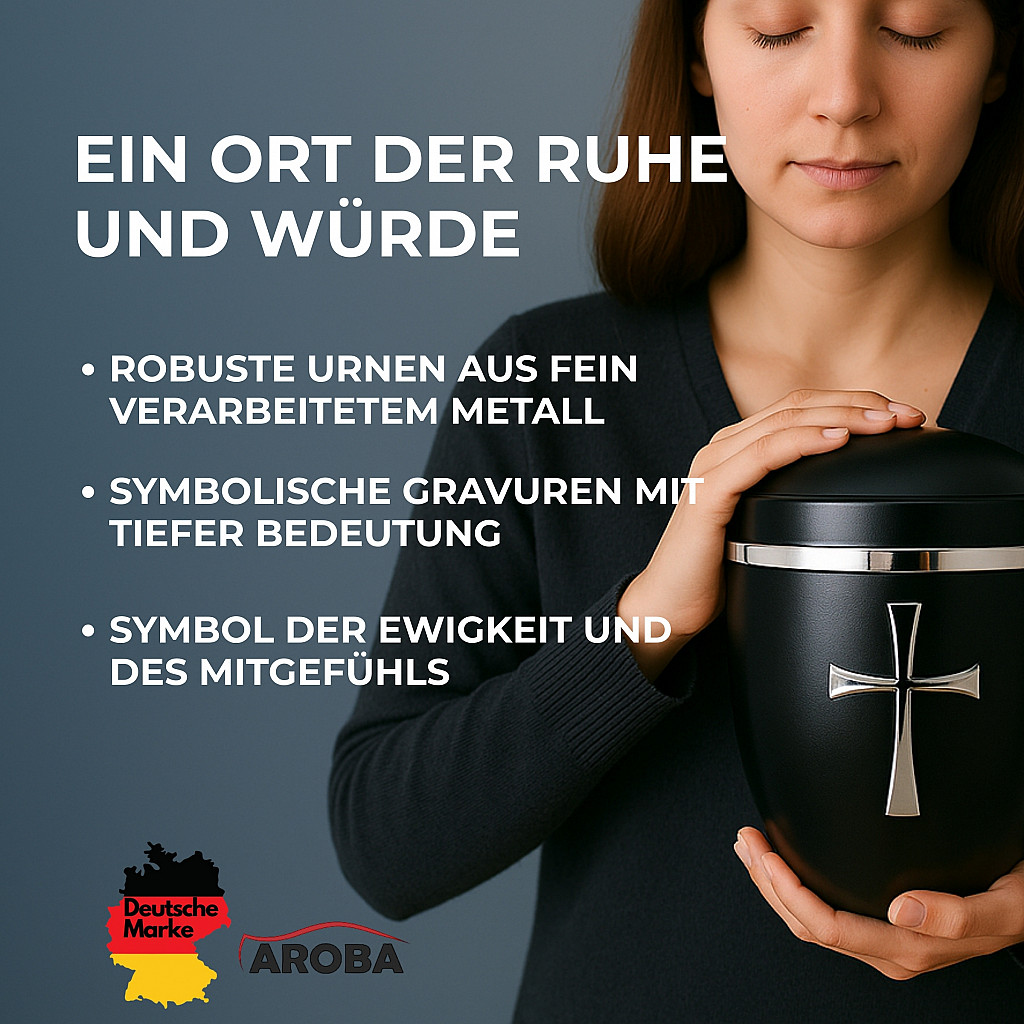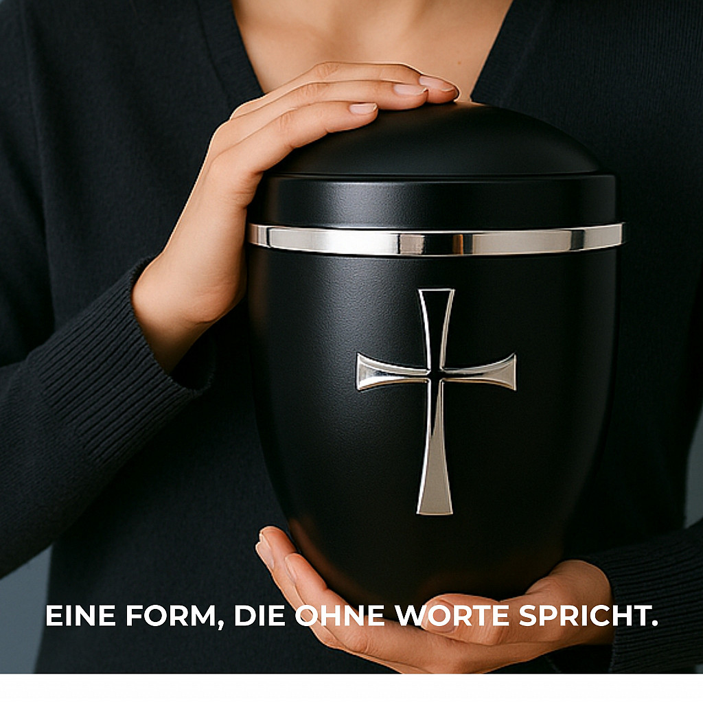 Das Schwarz dieser Urne symbolisiert Würde, Abschied und Stille – eine Farbe, die Trauer respektiert und Erinnerungen ehrt. Das Kreuz steht im Mittelpunkt des Designs und bietet Halt in einem Moment, in dem Worte oft fehlen. Die Gesamtgestaltung vermittelt eine stille Kraft und spirituelle Nähe.