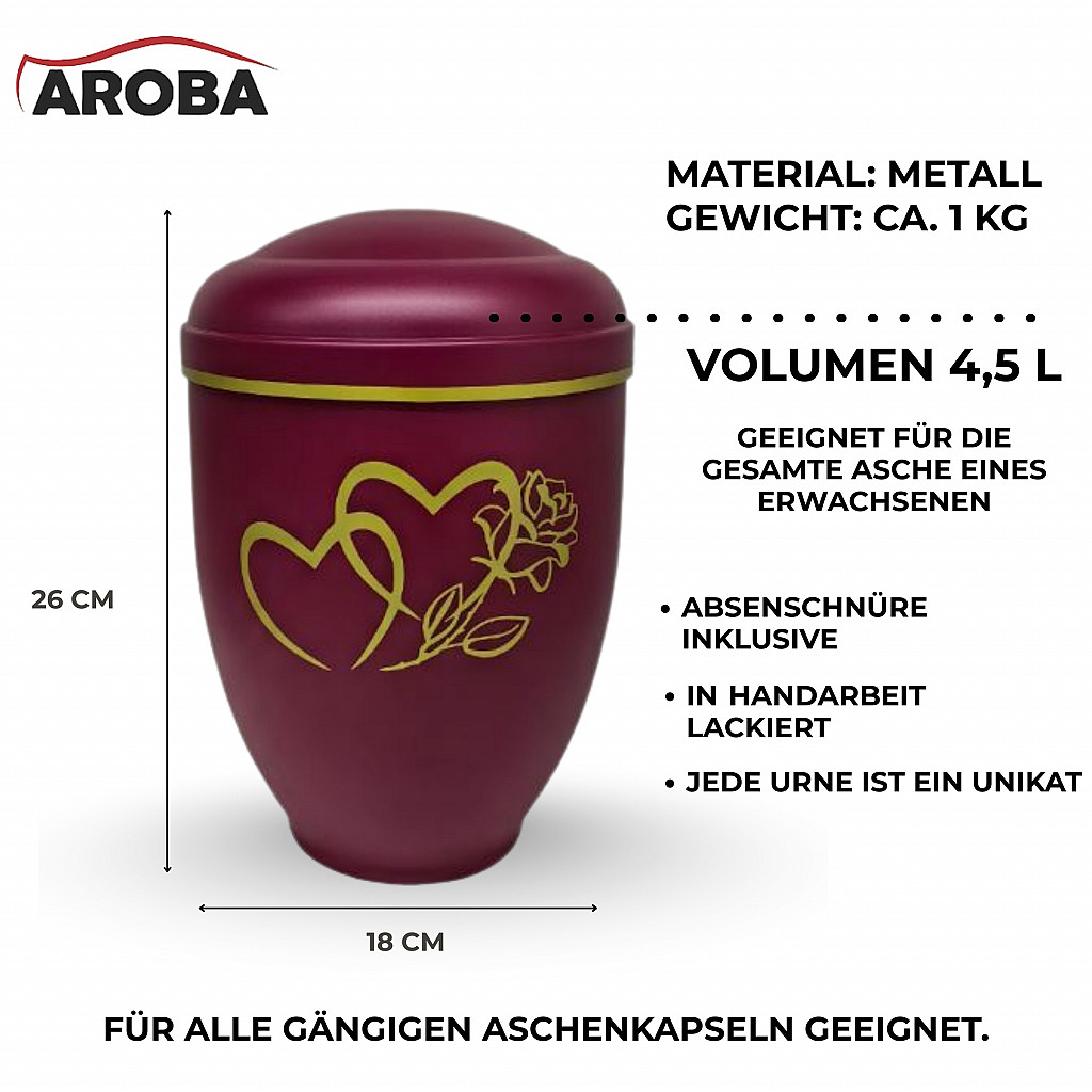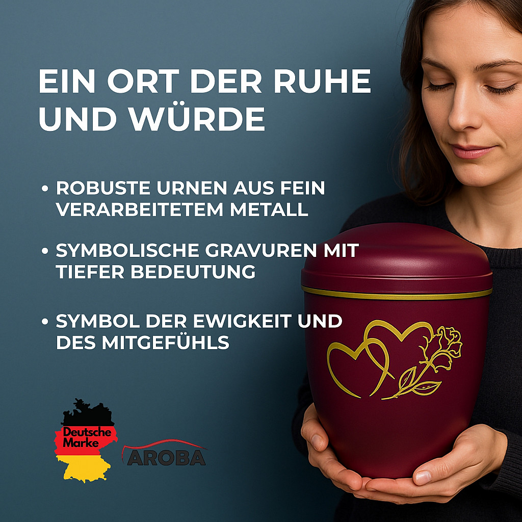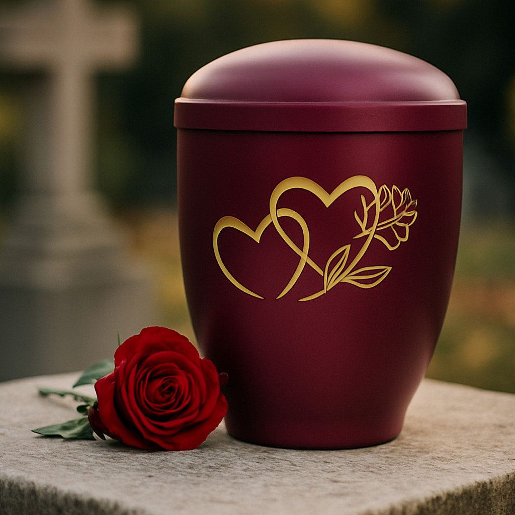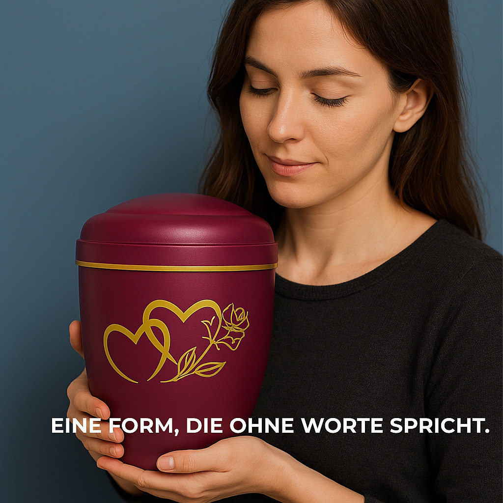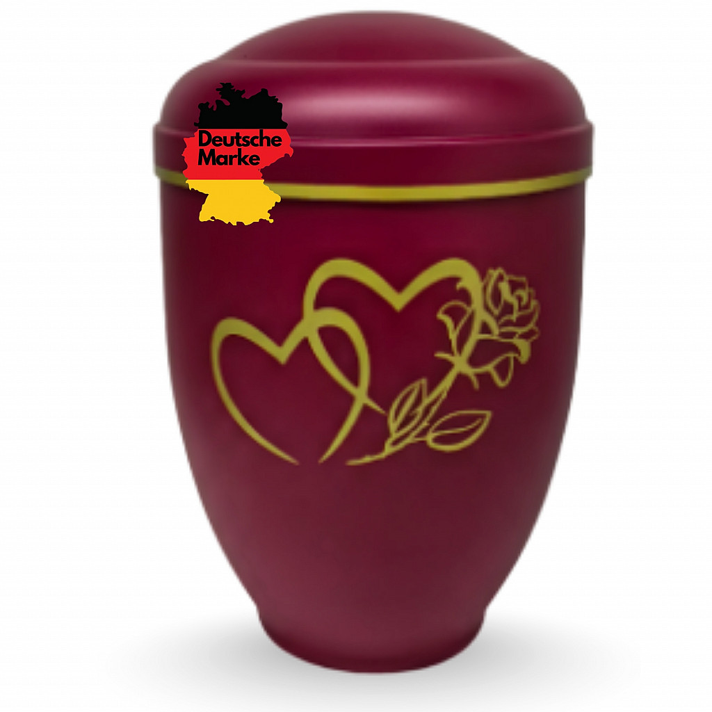 Diese Urne symbolisiert Liebe, die bleibt – über den Tod hinaus. Zwei ineinander verschlungene Herzen und eine Rose stehen als Gravur auf der Vorderseite für eine tiefe, persönliche Verbindung. Das Motiv ist in edlem Gold gehalten und wird durch die samtmatte bordeauxrote Oberfläche stilvoll ergänzt.