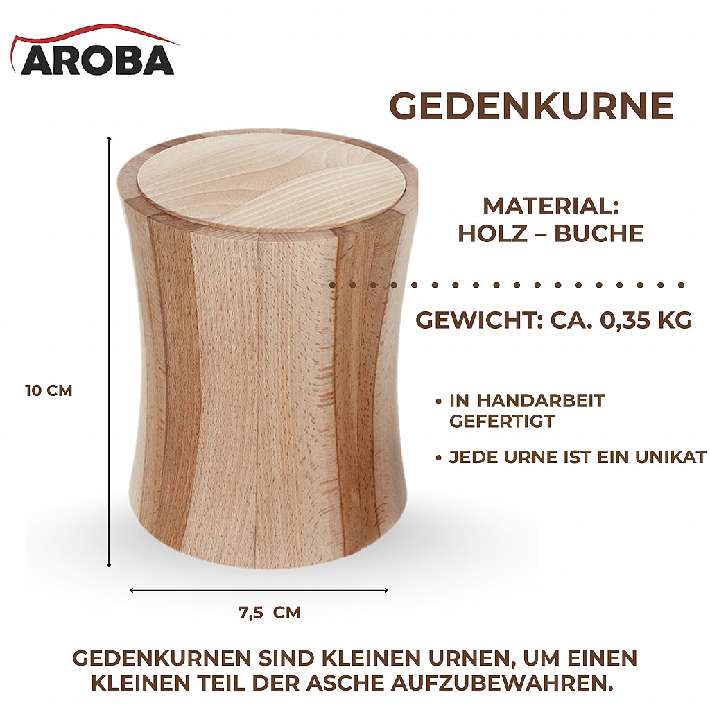 Der lose aufliegende Holzdeckel schließt bündig und fügt sich harmonisch in das ruhige Zylindrische Design ein – ganz ohne Schrauben oder technische Bauteile. Innen bietet die Urne (ca. 6 cm hoch, 4 cm breit) Platz für Symbolasche, persönliche Gegenstände oder rituelle Elemente. Gewicht: ca. 0,35 kg.