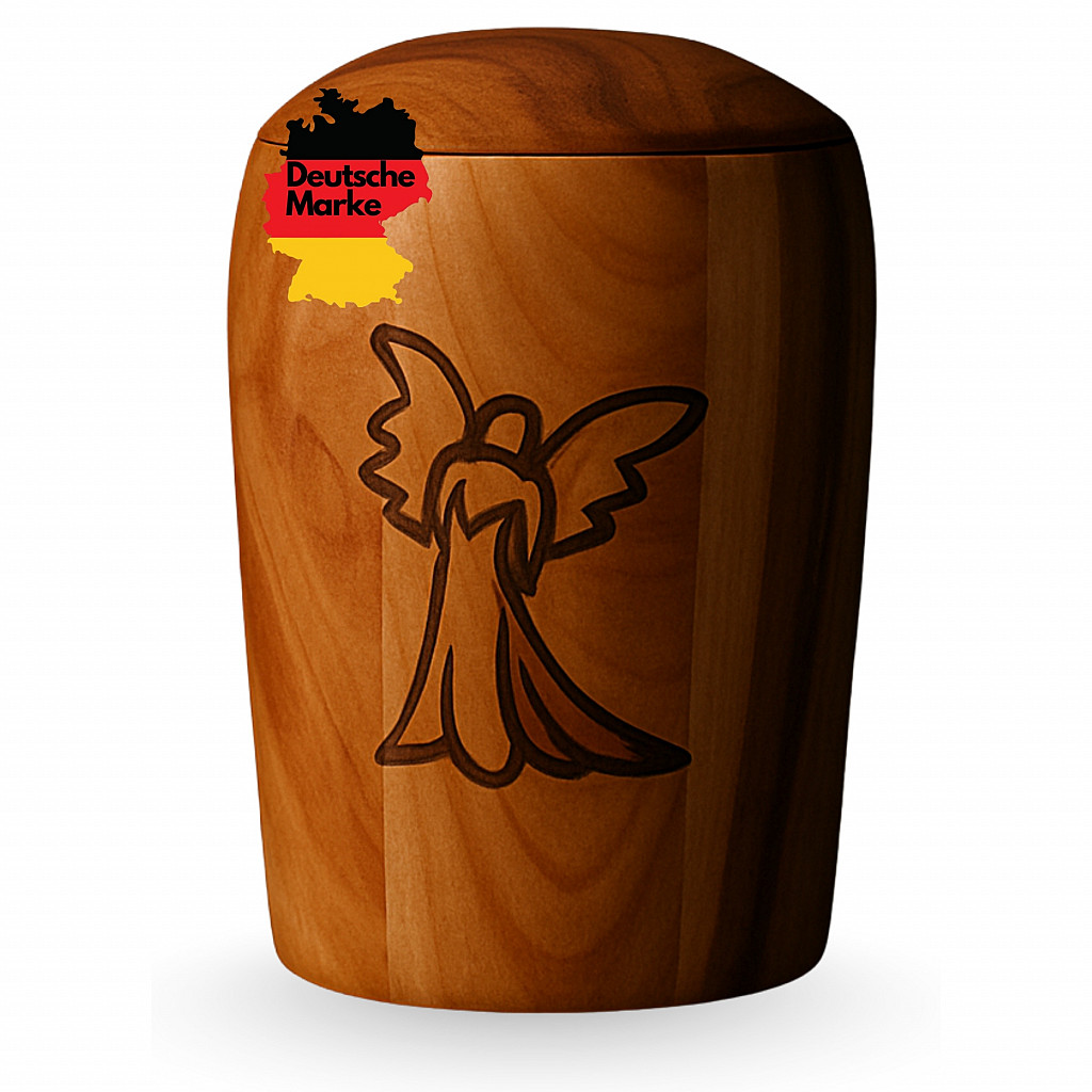 Der eingravierte Engel auf der Vorderseite ist mehr als ein Dekor: Er steht als Symbol für göttlichen Schutz, für Trost und für den Glauben, dass unsere Liebsten nicht allein sind. Diese spirituelle Gravur verleiht der Urne eine tiefe emotionale Bedeutung – ein stiller Begleiter auf dem Weg des Erinnerns.