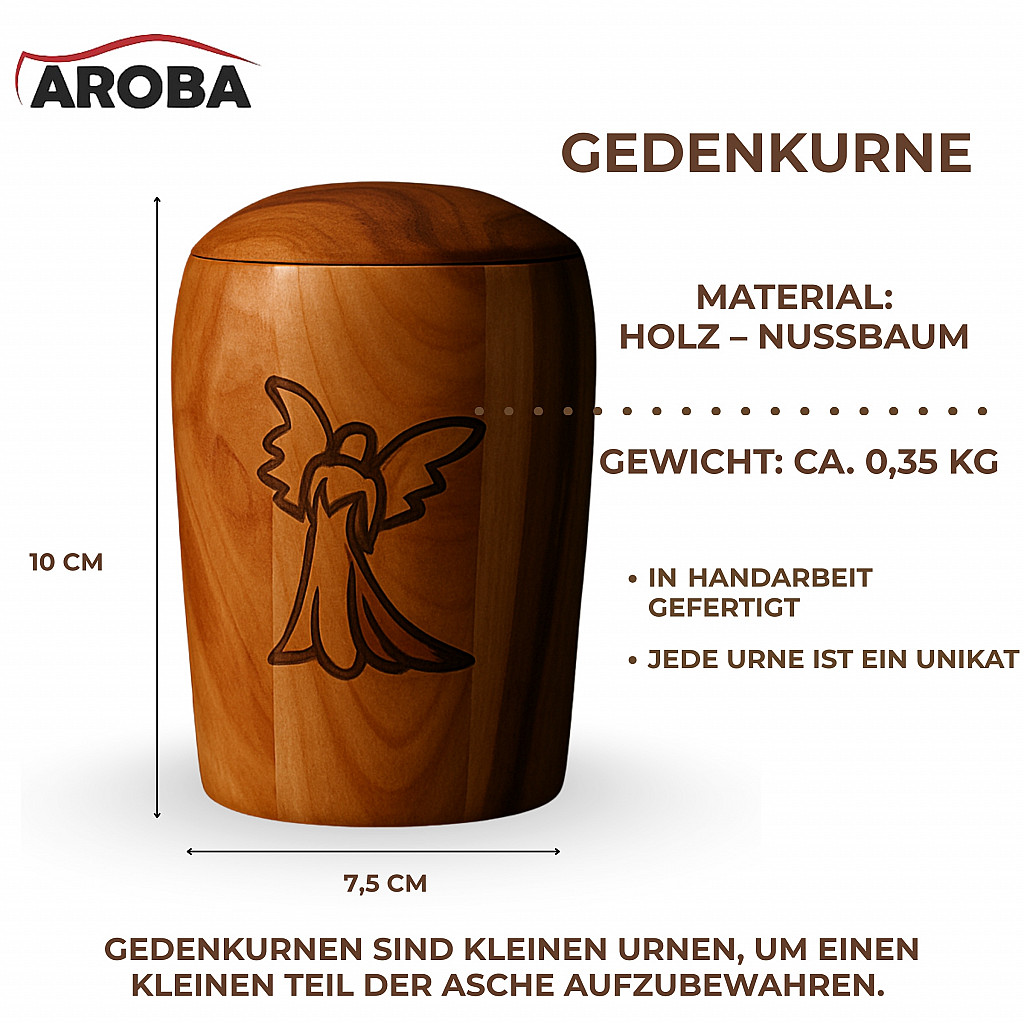 Mini-Urne aus Walnussholz mit Engel-Motiv – Handgefertigte Erinnerungsurne für einen kleinen Teil der Asche oder persönliche Andenken