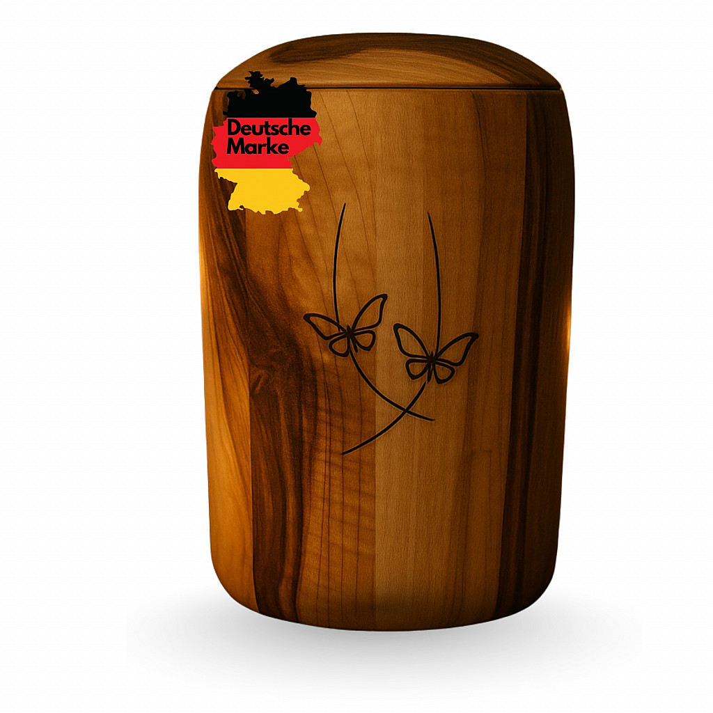 Handgefertigte Mini-Urne aus Walnussholz mit zwei Schmetterlingen – Erinnerungsurne – 10 cm hoch – Gedenkurne – Kleine Urne für Teilasche, Tierasche oder Erinnerungsstücke – Symbol für Seele, Wandel & Verbundenheit