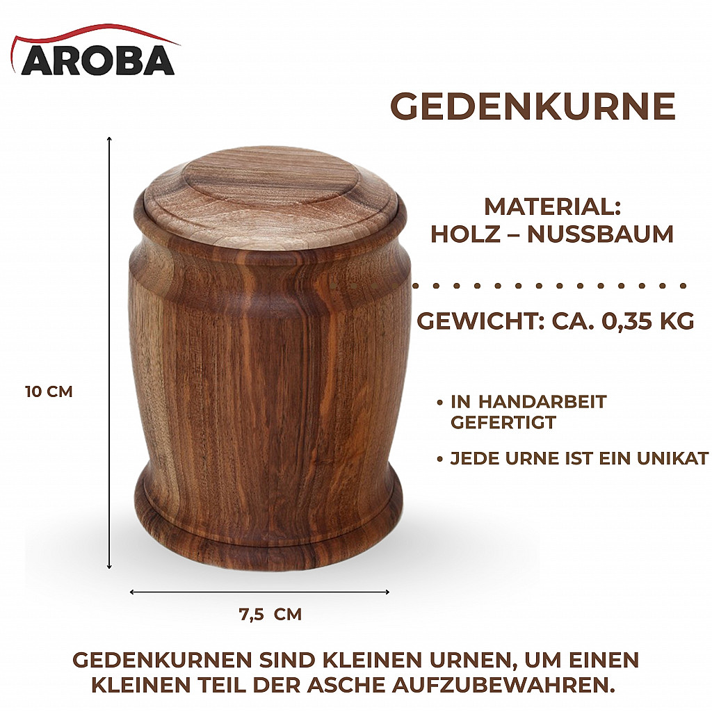 Diese kleine Urne wird aus hochwertigem Walnussholz in traditioneller Handarbeit gefertigt. Die natürliche Maserung, das warme, dunkle Holz und die runde, weiche Form machen sie zu einem würdevollen Ort für stille Erinnerungen.