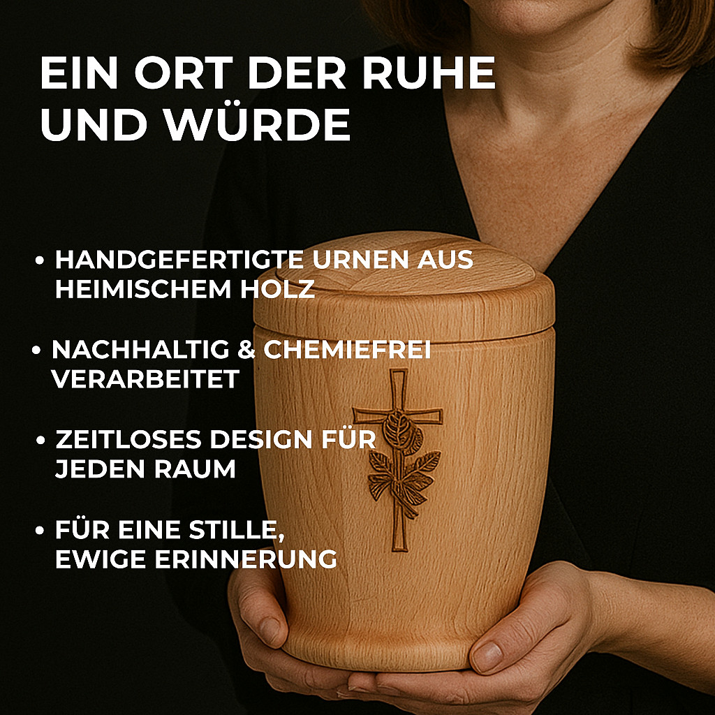 Handgefertigte Urne aus Buchenholz mit Kreuz-Rosen-Gravur – natürlich, symbolisch & stilvoll