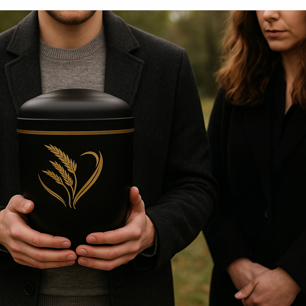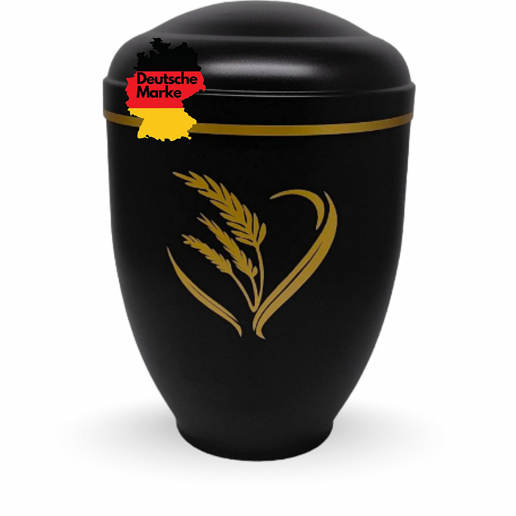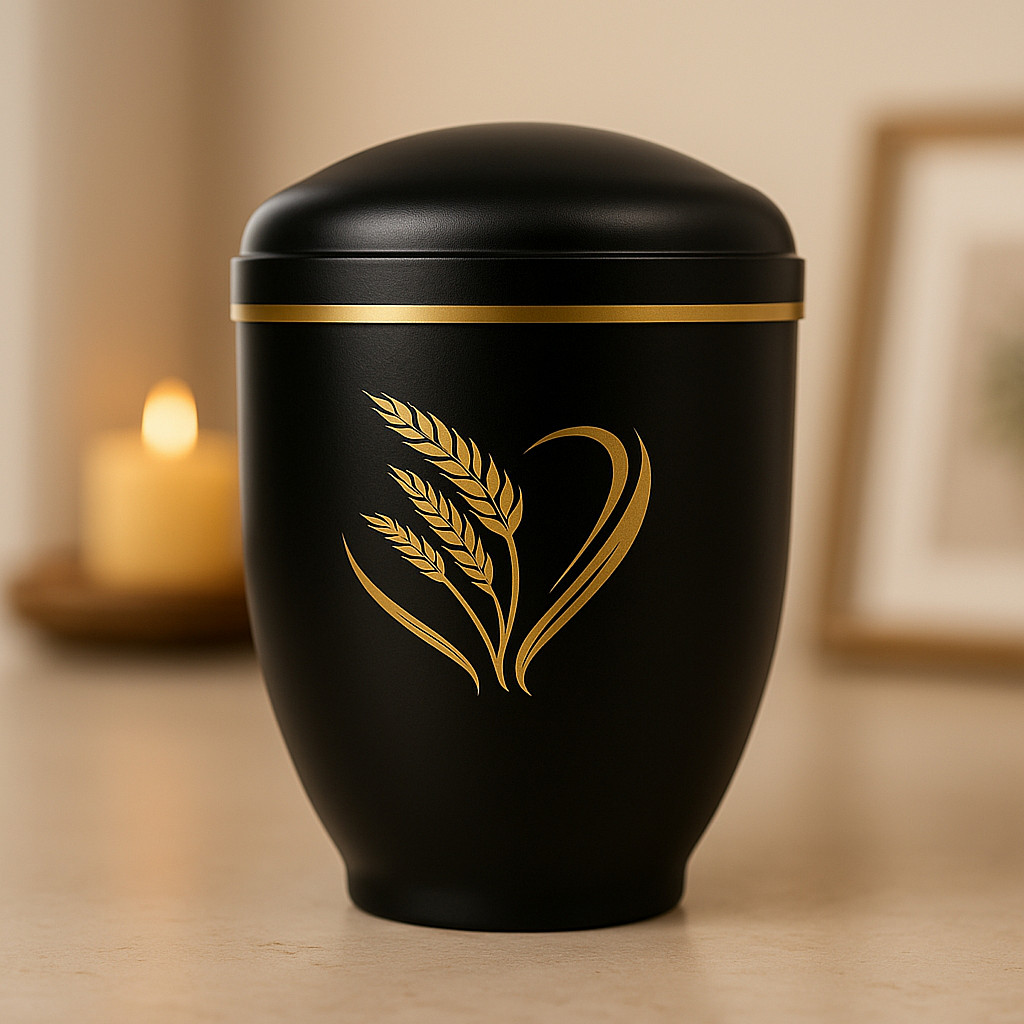 Diese Urne verbindet schlichte Eleganz mit tiefgründiger Symbolik. Ihre mattschwarze Metalloberfläche wirkt ruhig, kraftvoll und respektvoll – ideal für den würdevollen Abschied eines geliebten Menschen. Die eingravierte goldene Ähre auf der Vorderseite steht für den Kreislauf des Lebens, Reife und das Erinnern an gelebte Fülle.