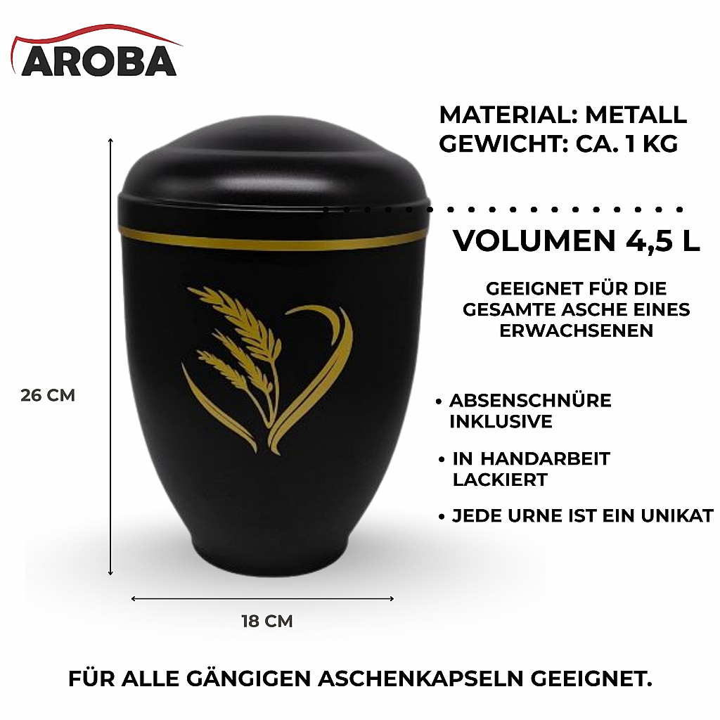 Mattschwarze Metallurne mit goldener Ähren-Gravur – Gedenkurne für Erwachsene – 4,5 L Volumen – Mit Einsatz für Aschekapsel