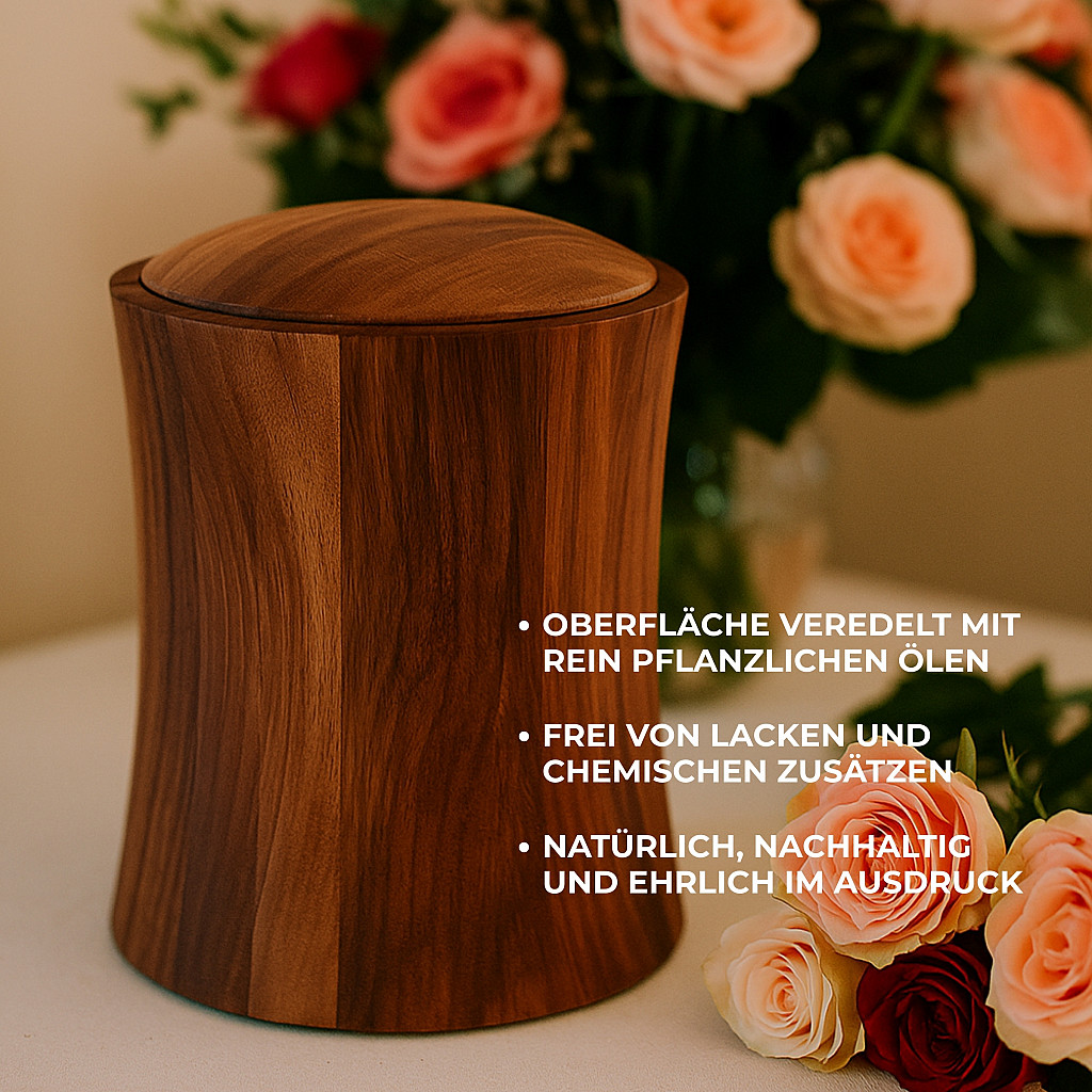 - Massives Walnussholz aus heimischer Fertigung: Jede Urne wird in sorgfältiger Handarbeit aus heimischem Walnussholz gefertigt – einem der edelsten und wärmsten Hölzer. Die natürliche Maserung verleiht jedem Stück ein einzigartiges Erscheinungsbild. Die Oberfläche wird ausschließlich mit pflanzlichen Ölen behandelt – ohne Lack, ohne Lösungsmittel.