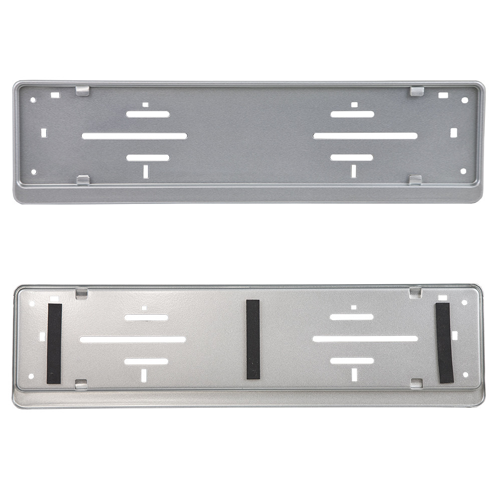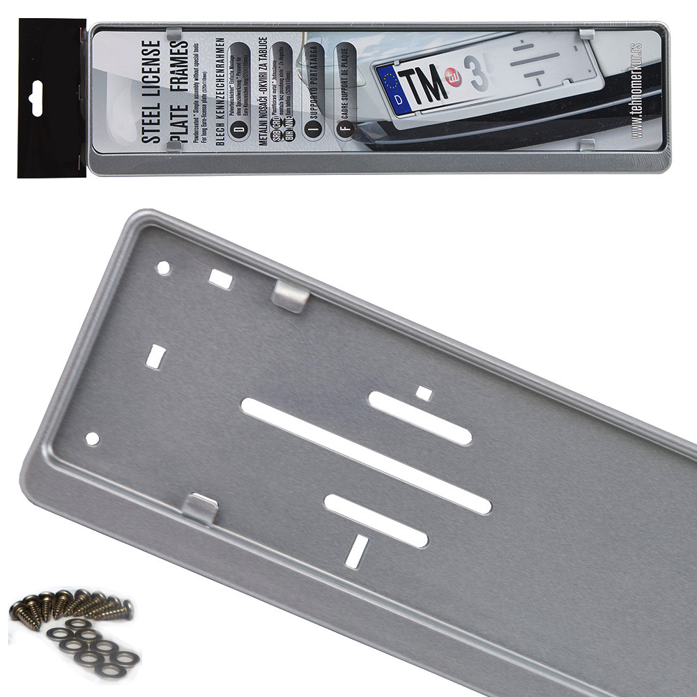 • 2x držača registarske pločice (par za prednju + stražnju stranu) od srebrnog čelika s prašnim premazom