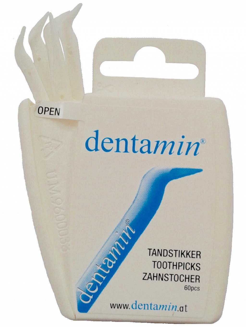 Zobotrebci so pakirani v majhni praktični škatlici z dozirnikom, idealni za uporabo na poti. Dentamin je izdelan iz materiala PP in se med zobmi ne lomi kot običajni leseni zobotrebci! Dentamin je poseben zobotrebec, ki čiščenje zob naredi enostavno. Zahvaljujoč kljukici, je čiščenje zadnje strani zob, preprosto. Sicer se uporablja kot običajen zobotrebec. Izognite se ostankom hrane med zobmi in tako preprečite slab zadah ter karies. Ni zaman imenovan zobotrebec nove generacije. Vzemite Dentamin zobotrebec minuto po vsakem obroku, za zdrav nasmeh. Zaradi edinstvene zasnove je patentirani Dentamin zobotrebec idealen partner za dobro ustno higieno. Priporočajo ga zobozdravniki.